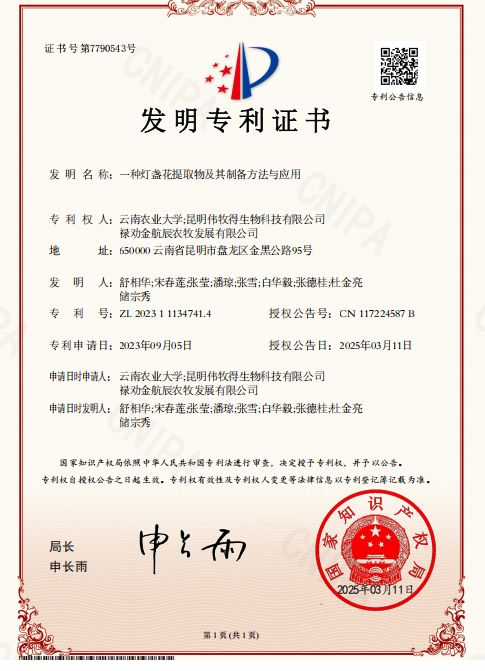 舒相华教授等获发明专利一项——“一种灯盏花提取物及其制备方法与应用”
